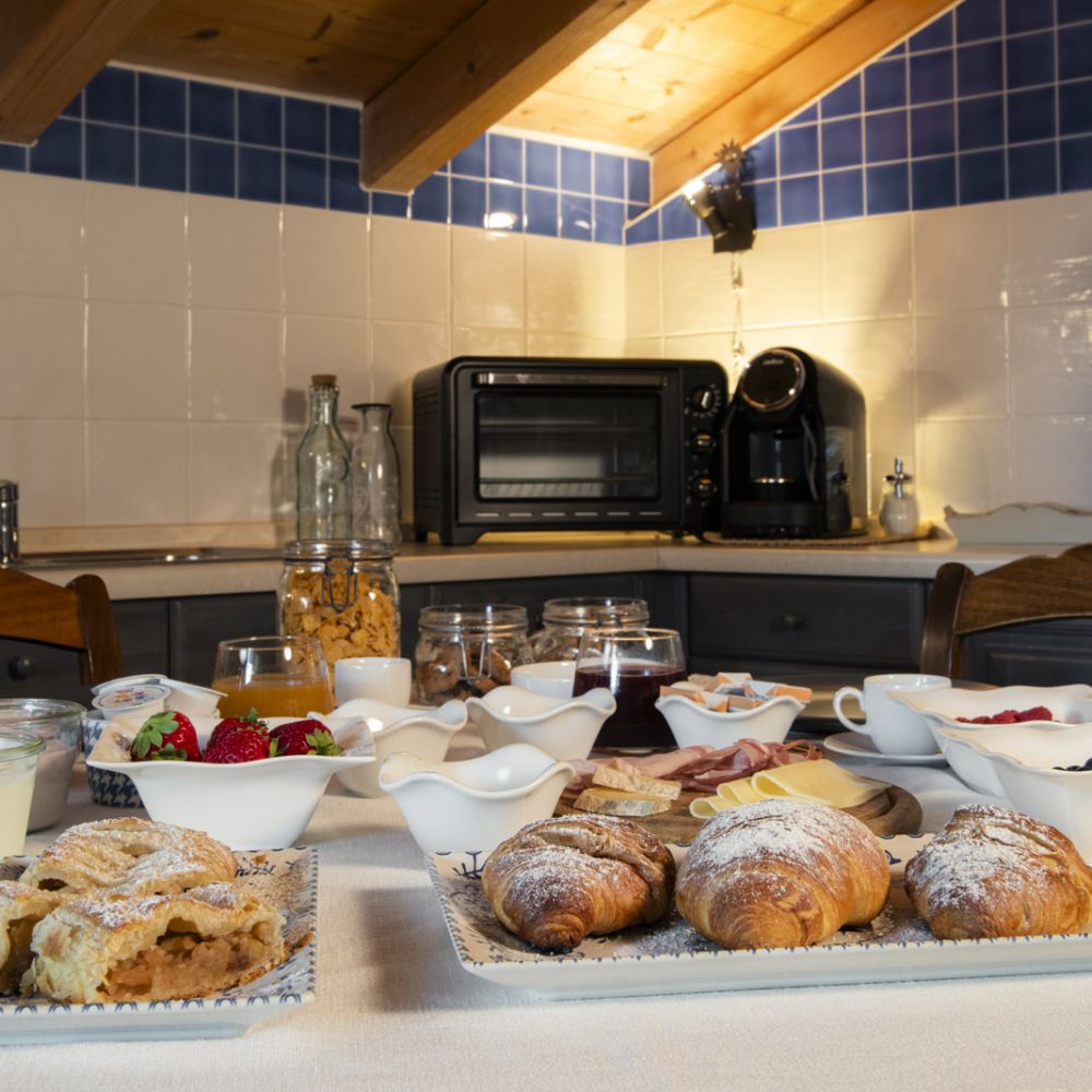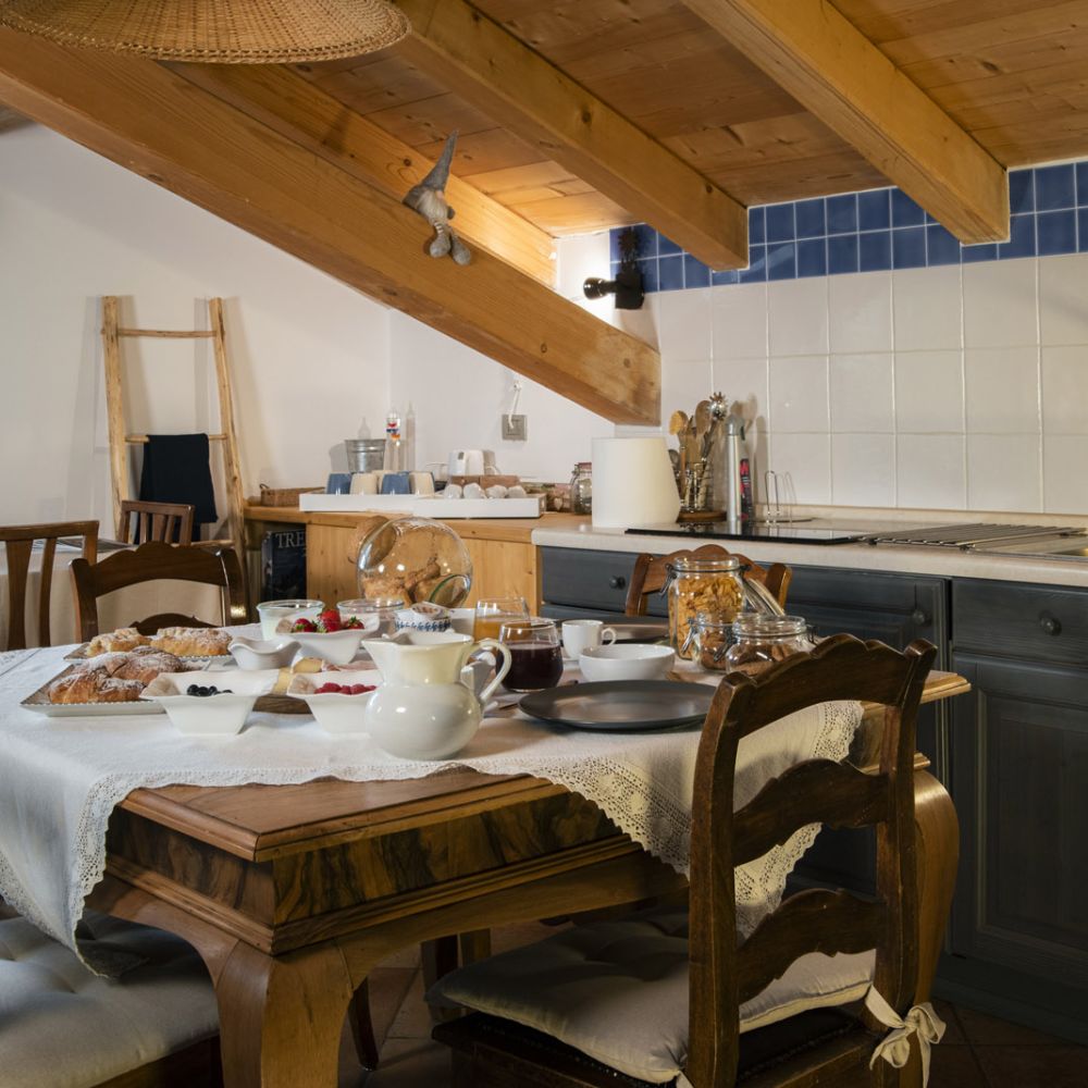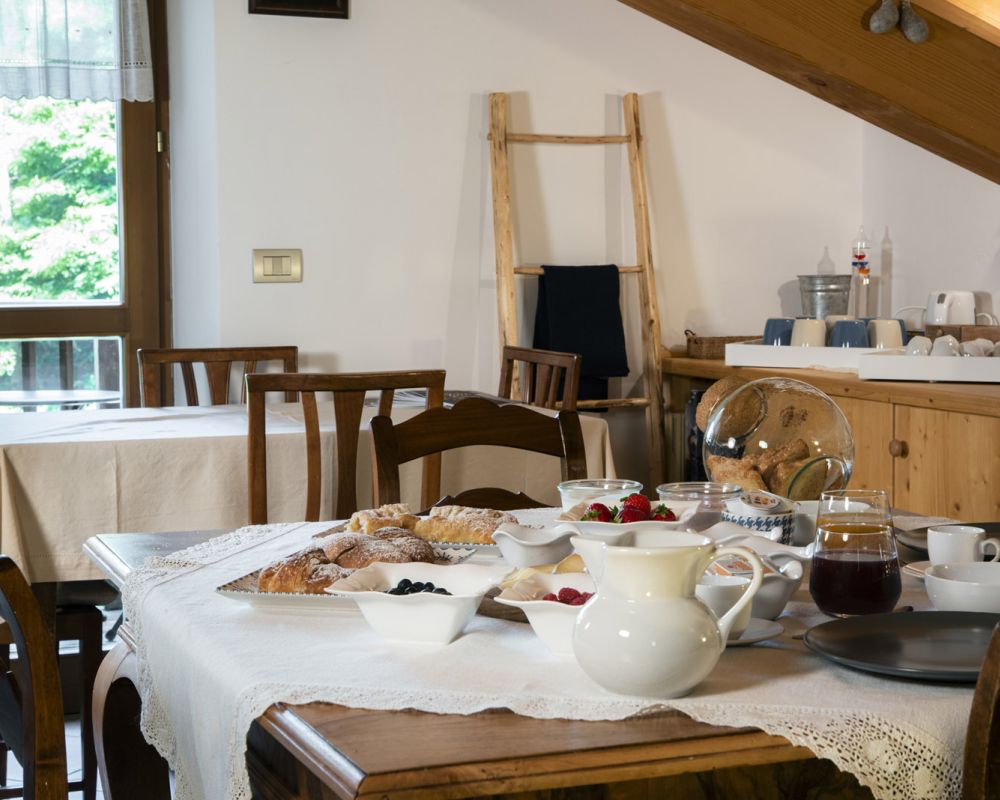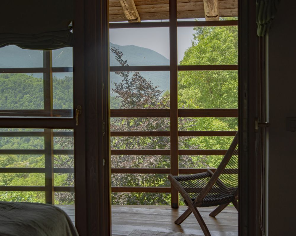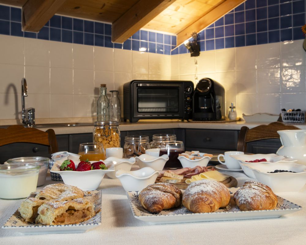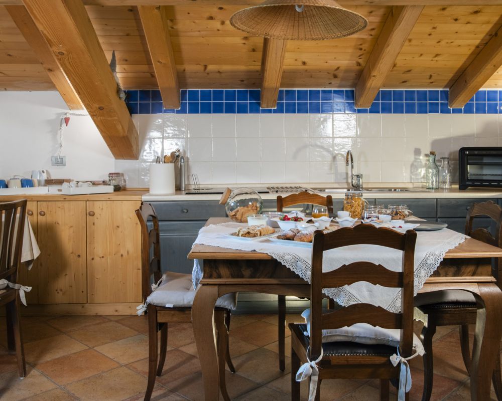 Dal terrazzino in legno potrai ammirare boschi e montagne, rilassarti sotto il sole o leggere in assoluta tranquillità. La cucina ti accoglie con profumi di dolci fatti in casa e colazioni genuine, per iniziare la giornata con energia e serenità